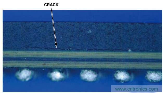 圖3. 過度加熱導致PBGA上出現裂紋的低放大率圖像(側視圖)
