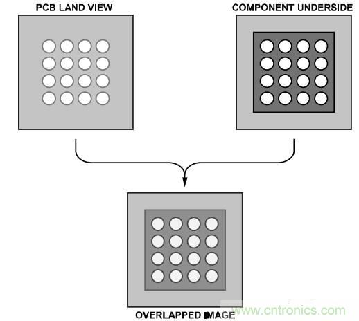 將器件精準貼放到電路板上是很重要的。帶分光束光學系統的貼片設備有助于PBGA和電路板的對齊。此類成像系統涉及到將PBGA焊球鏡像疊放在PCB焊盤鏡像上(參見圖10)。貼片機必須具有支持用戶沿x軸和y軸進行微調(包括旋轉)的能力。