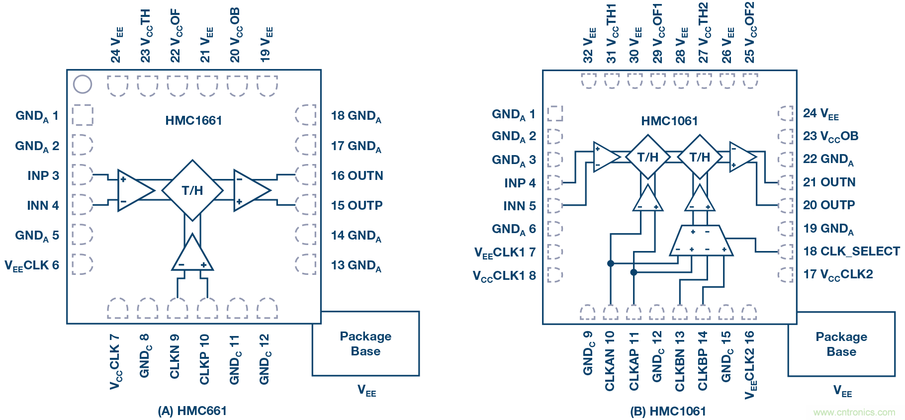 以單級THA HMC661為例,產生的輸出由兩段組成。在輸出波形(正差分時鐘電壓)的采樣模式間隔中,器件成為一個單位增益放大器,在輸入帶寬和輸出放大器帶寬的約束下,它將輸入信號復制到輸出級。在正時鐘到負時鐘躍遷時,器件以非常窄的采樣時間孔徑對輸入信號采樣,并且在負時鐘間隔內,將輸出保持在一個相對恒定的代表采樣時刻信號的值。配合ADC進行前端采樣時,常常優先使用單級器件(ADI 同時法布里了兩級THA 的型號HMC1061),原因是多數高速ADC已經在內部集成一個THA,其帶寬通常要小得多。因此,在ADC之前增加一個THA便構成一個復合雙級組件(或一個三級組件,如果使用的是雙級HMC1061),THA在轉換器前面。采用同等技術和設計時,單級器件的線性度和噪聲性能通常優于雙級器件,原因是單級器件的級數更少。所以,單級器件常常是配合高速ADC進行前端采樣的最佳選擇。