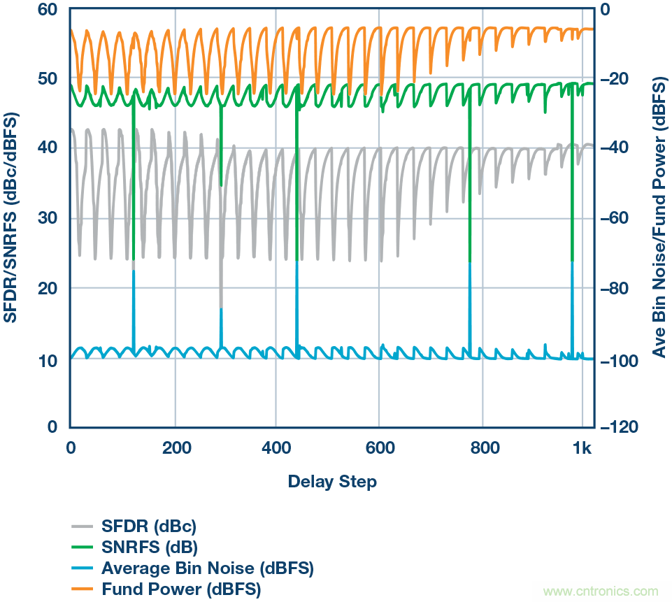 為了獲得最佳延遲設置,將一個信號施加于THA和ADC組合,該信號應在ADC帶寬范圍之外。本例中,我們選擇一個約10 GHz的信號,并施加-6 dBFS的電平(在FFT顯示屏上捕獲)。延遲設置現在以二 進制步進方式掃描,信號的電平和頻率保持恒定。在掃描過程中顯示并捕獲FFT,收集每個延遲設置對應的基波功率和無雜散動態范圍 (SFDR) 數值。