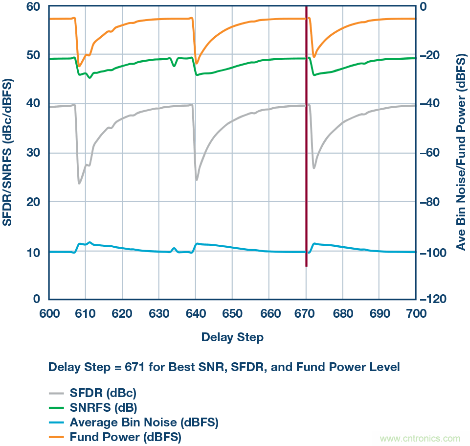 結果如圖3a所示,基波功率、SFDR和SNR將隨所應用的每個設置而變化。如圖所示,當把采樣位置放在更好的地方(THA將樣本送至ADC的過程之中)時,基波功率將處于最高水平,而SFDR應處于最佳性能(即最低)。圖3b為延遲映射掃描的放大視圖,延遲設定點為671,即延遲應該保持固定于此窗口/位置。請記住,延遲映射程序僅對系統的相關采樣頻率有效,如果設計需要不同的采樣時鐘,則需要重新掃描。本例中,采樣頻率為4 GHz,這是該信號鏈中使用的THA器件的最高采樣頻率。
