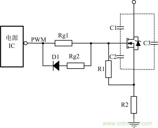 關斷瞬間驅動電路能提供一個盡可能低阻抗的通路供MOSFET柵源極間電容電壓快速泄放,保證開關管能快速關斷。為使柵源極間電容電壓的快速泄放,常在驅動電阻上并聯一個電阻和一個二極管,如圖3所示,其中D1常用的是快恢復二極管。這使關斷時間減小,同時減小關斷時的損耗。Rg2是防止關斷的時電流過大,把電源IC給燒掉。