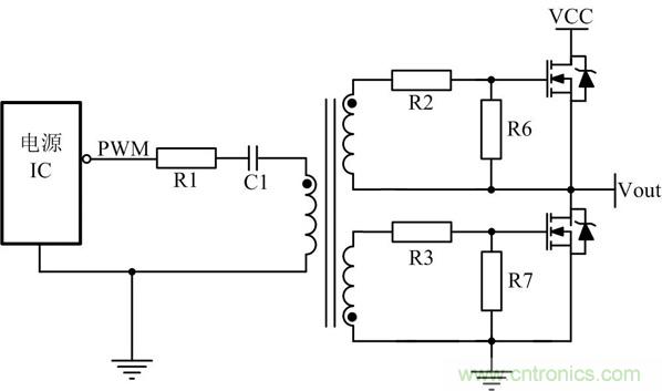 為了滿足如圖5所示高端MOS管的驅動,經常會采用變壓器驅動,有時為了滿足安全隔離也使用變壓器驅動。其中R1目的是抑制PCB板上寄生的電感與C1形成LC振蕩,C1的目的是隔開直流,通過交流,同時也能防止磁芯飽和。