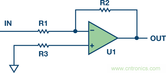 在同相接地輸入端增加一個(gè)與輸入電阻R1和反饋電阻R2的并聯(lián)組合相等的電阻(圖1中的R3),可以讓阻抗相等。做一些計(jì)算可以證明,誤差降至Ioffset × R feedback 。由于I offset 為I bias 的10%到20%,所以這會(huì)有助于降低輸出失調(diào)誤差。