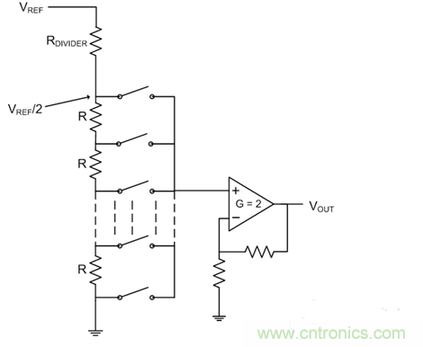 電阻串 DAC 設計最終、最微妙的元件是位于串電阻器及接點之前的分壓器。該電阻器電阻等于串中其余電阻器的等效阻抗,能有效將參考輸入減半。這樣做的目的是降低輸出緩沖器的共模輸入要求,并在實現良好性能的同時幫助保持低成本。為了對此進行補償,輸出緩沖器一般采取 2 倍的非反相增益,盡管有時反饋電阻器通過數字控制實現不同增益。