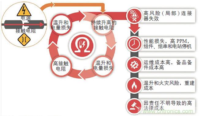 電站的盈利能力與選擇高質量的部件息息相關。業主在光伏連接器上節省資金,并不是一種明智的做法。因為,不注重質量,通常意味著后續的高損失和風險,而這些本可避免。光伏連接器的低接觸電阻及長期可靠性,能夠保障電站高效和安全運行。而持續升高的接觸電阻會導致光伏項目的安全風險大幅提高,降低電站運行效率。需要指出的是,各種不同的風險因素是密切相關的,如圖1 所示。