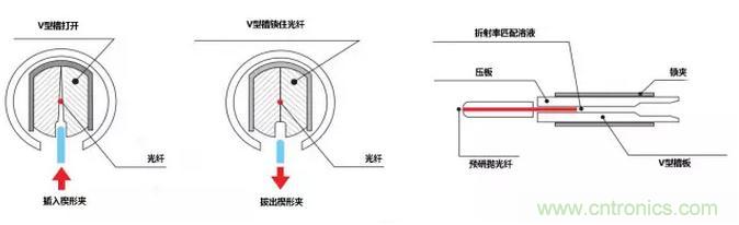 光纖快速連接器/冷接子可分為預置光纖和非預置光纖兩大類。預置光纖快速連接器/冷接子的接續(xù)點在連接器內部,并預置有匹配液;非預置光纖快速連接器/冷接子的接續(xù)點在連接器表面,不預置匹配液,直接通過適配器與目標光纖對接。非預置光纖快速連接器/冷接子的工作原理很簡單,這里不做贅述。下面詳細說明預置光纖快速連接器/冷接子的原理:如下圖所示,預置光纖膠接在插芯中,接續(xù)點設在放有折射率近似纖芯的導光材料-匹配液的V型槽中,從而實現(xiàn)預置光纖和目標光纖的無縫貼合。