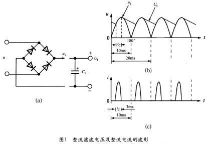 50Hz交流電壓經過全波整流后變成脈動直流電壓u1,再通過輸入濾波電容得到直流高壓U1。在理想情況下,整流橋的導通角本應為180°(導通范圍是從 0°~180°),但由于濾波電容器C的作用,僅在接近交流峰值電壓處的很短時間內,才有輸入電流流經過整流橋對C充電。50Hz交流電的半周期為 10ms,整流橋的導通時間tC≈3ms,其導通角僅為54°(導通范圍是36°~90°)。因此,整流橋實際通過的是窄脈沖電流。橋式整流濾波電路的原 理如圖1(a)所示,整流濾波電壓及整流電流的波形分別如圖l(b)和(c)所示。