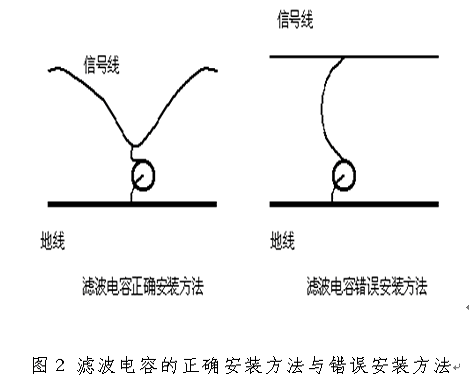 電容的諧振頻率由ESL和C共同決定,電容值或電感值越大,則諧振頻率越低,也就是電容的高頻濾波效果越差。ESL除了與電容器的種類(lèi)有關(guān)外,電容的引線(xiàn)長(zhǎng)度是一個(gè)十分重要的參數(shù),引線(xiàn)越長(zhǎng),則電感越大,電容的諧振頻率越低。因此在實(shí)際工程中,要使電容器的引線(xiàn)盡量短,電容器的正確安裝方法和不正確安裝方法如圖2所示。