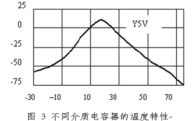 由于電容器中的介質(zhì)參數(shù)受到溫度變化的影響,因此電容器的電容值也隨著溫度變化。不同的介質(zhì)隨著溫度變化的規(guī)律不同,有些電容器的容量當(dāng)溫度升高時(shí)會(huì)減小70%以上,常用的濾波電容為瓷介質(zhì)電容,瓷介質(zhì)電容器有超穩(wěn)定型:COG或NPO,穩(wěn)定型:X7R,和通用型:Y5V或Z5U三種。不同介質(zhì)的電容器的溫度特性如圖2所示。