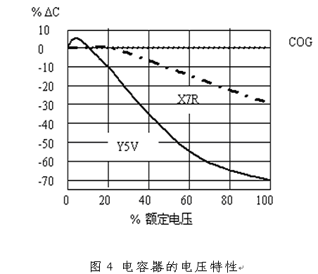 電容器的電容量不僅隨著溫度變化,還會(huì)隨著工作電壓變化,這一點(diǎn)在實(shí)際工程必須注意。不同介質(zhì)材料的電容器的電壓特性如圖3所示。從圖中可以看出,X7R電容器在額定電壓狀態(tài)下,其容量降為原始值的70%,而Y5V電容器的容量降為原始值的30%!了解了這個(gè)特性,在選用電容時(shí)要在電壓或電容量上留出余量,否則在額定工作電壓狀態(tài)下,濾波器會(huì)達(dá)不到預(yù)期的效果。