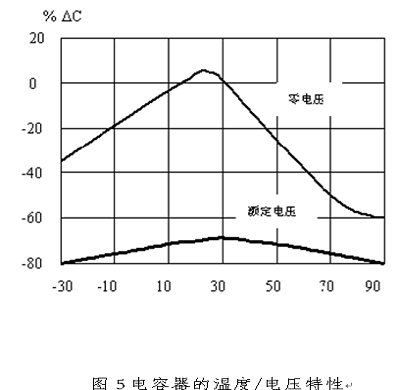 從圖中可以看到,COG電容器的容量幾乎隨溫度沒(méi)有變化,X7R電容器的容量在額定工作溫度范圍變化12%以下,Y5V電容器的容量在額定工作溫度范圍內(nèi)變化70%以上。這些特性是必須注意的,否則會(huì)出現(xiàn)濾波器在高溫或低溫時(shí)性能變化而導(dǎo)致設(shè)備產(chǎn)生電磁兼容問(wèn)題。
