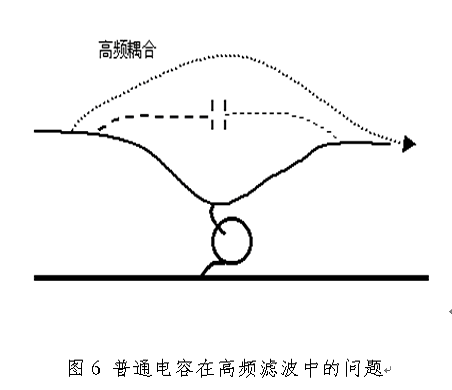 在實(shí)際工程中,要濾除的電磁噪聲頻率往往高達(dá)數(shù)百M(fèi)Hz,甚至超過(guò)1GHz。對(duì)這樣高頻的電磁噪聲必須使用穿心電容才能有效地濾除。普通電容之所以不能有效地濾除高頻噪聲,是因?yàn)閮蓚€(gè)原因,一個(gè)原因是電容引線(xiàn)電感造成電容諧振,對(duì)高頻信號(hào)呈現(xiàn)較大的阻抗,削弱了對(duì)高頻信號(hào)的旁路作用;另一個(gè)原因是導(dǎo)線(xiàn)之間的寄生電容使高頻信號(hào)發(fā)生耦合,降低了濾波效果,如圖5所示。