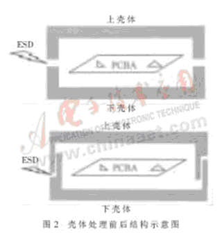 其一,用“堵”的方法。盡量增加殼體的厚度,即增加外殼到電路板之間的距離,或者通過一些等效方法增加殼體氣隙的距離,這樣可以避免或者大大減少ESD的能量強度,如圖2所示。