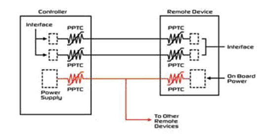 圖3 PPTC器件能夠保護(hù)控制器和遙控裝置之間的連接線路以及電源輸入電路