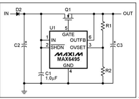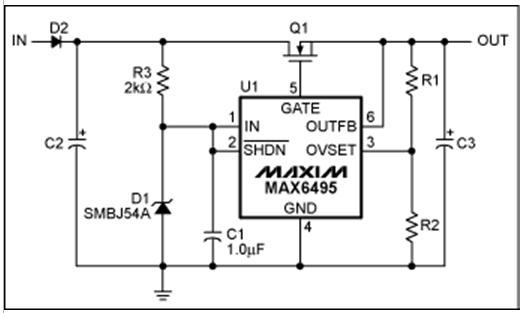 過壓保護(hù)(OVP)器件數(shù)據(jù)資料中提供的典型電路可以滿足大多數(shù)應(yīng)用的需求(圖1)。然而,有些應(yīng)用需要對基本電路進(jìn)行適當(dāng)修改。本文討論了兩種類似應(yīng)用:增大電路的最大輸入電壓,在過壓情況發(fā)生時利用輸出電容存儲能量。