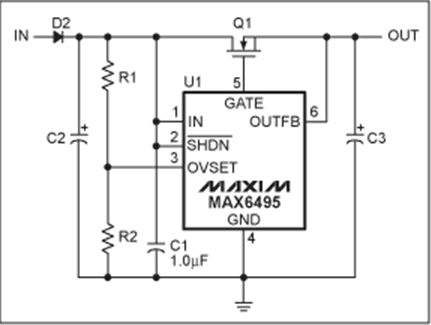 MAX6495–MAX6499/MAX6397/MAX6398過壓保護(hù)(OVP)器件用于保護(hù)后續(xù)電路免受甩負(fù)載或瞬間高壓的破壞。器件通過控制外部串聯(lián)在電源線上的n溝道MOSFET實(shí)現(xiàn)。當(dāng)電壓超過用戶設(shè)置的過壓門限時,拉低MOSFET的柵極,MOSFET關(guān)斷,將負(fù)載與輸入電源斷開。