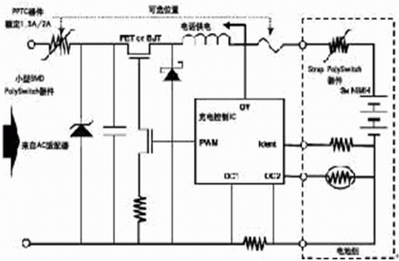 在該電路中,未經穩壓的電源轉換器直流輸出電壓經過穩壓電路調制,轉變成適當的電壓對電池進行充電。PPTC器件和電壓過載保護器件相互配合,可以對以下故障起保護作用:
