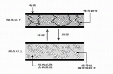 PPTC電路保護組件是以特殊塑料及傳導性粒子混合而成的傳導式聚合物,如圖1所示。在常溫下,該傳導性粒子會在聚合物中形成低阻值鏈路,當溫度上升超過該組件的切換溫度時,聚合物中的微晶粒就會熔化,變成非結晶狀。當微晶粒階段熔化期間數量增加時,會使傳導性粒子分離,導致該組件內阻抗呈非線性增加。產生熱的原因是由于周圍環境或電池溫度上升所致,也可能受到過電流狀態下阻抗加熱引起,或是因前述不當的充電產生。