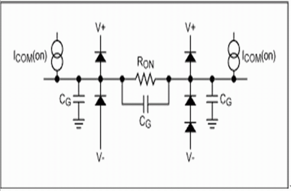 模擬開關內的通道元件通常包括一個或更多的MOSFET,同時還包含有寄生鉗位二極管(鉗位至電源電壓),用于ESD保護。圖1顯示了一個閉合的模擬開關的等效電路圖。只要V+和V-存在,并且輸入電壓不超過:電源電壓 + 鉗位二極管的正向偏壓(典型0.6V),二極管就處于反向偏置,沒有電流通過。