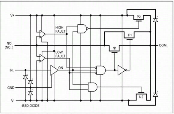 開關內部的兩個比較器用于監視輸入電壓,它們將輸入電壓與電源電壓V+和V-進行比較。當NO (常開)端或NC (常閉)端上的信號位于V+和V-之間時,開關正常工作。當信號電壓超出電源約150mV時(故障情況),輸出電壓(COM)被限制在電源電壓—保持相同極性且輸入為高阻。這是在故障比較器的控制下實現的,它在故障情況下關閉了N1和P1。故障比較器同時還按照以下規則控制鉗位FET (N2和P2):如果開關閉合時出現了負極性故障,接通N2連接COM到V-。如果開關閉合時出現了正極性故障,則接通P2連接COM到V+。如果開關開路時出現了故障,則輸出呈現高阻。