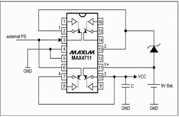 VCC由第10引腳的開關取出,大多數應用中,這個電壓還要由后面的電壓調節器進行調理。一旦檢測到外部電源電壓,微控制器接通開關1和4,斷開開關3。輸出電容C在VCC由開關3切向開關4的過程中為系統提供電源。為了保護電池,當開關4閉合時,必須始終保持開關3處于斷開狀態。外部電源移走后,開關4和1斷開而開關3閉合。當外部電源電壓高于電池電壓,或電池已深度放電時接入外部電源,或C已充電而電池被移走時,故障保護特性可以保證開關正確、安全地工作。