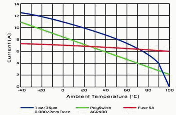 必須注意的是,在整個溫度范圍內(nèi),PPTC器件的觸發(fā)電流是如何跟隨印制線上的電流。在這兩種情況中,即使可以使用熔斷器,在汽車高于有用的標(biāo)準(zhǔn)溫度下,尺寸最接近的熔斷器也不能保護(hù)它。