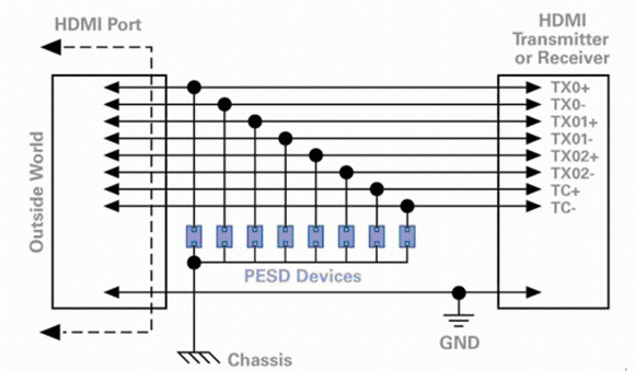 圖2是一個典型的HDMI電路保護設計,其中使用了瑞侃電路保護部門的PESD器件。這些保護器件將ESD旁路,不讓它進入容易因靜電放電而損壞的電路,而且與傳統的多層變阻器(MLV)或瞬變電壓抑制二極管(TVS管)相比,它的電容極小。