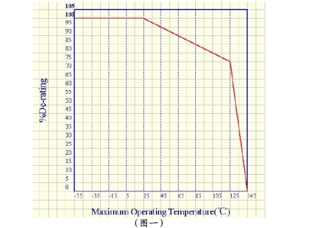 1. 溫度折減率: 當熔斷器工作的環境溫度高于25℃時必須考慮溫度的影響,在選擇熔斷器額定值時可依據:額定電流=工作電流/0.75/溫度折減率。 例如:如果工作溫度為65℃,從AEM溫度折減曲線可查出折減系數為90%,如果工作電流為4A,則我們應該選用的熔斷器額定值為:4/0.75/90%=5.9A或6A。