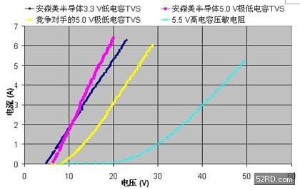 Ashton博士說在正常工作條件下,ESD保護元件應該保持在不動作狀態(tài),同時不會對電子系統(tǒng)的功能造成任何影響,這可以通過維持低電流以及足以在特定數(shù)據(jù)傳輸速率下維持數(shù)據(jù)完整性的低電容值來達成。而在ESD應力沖擊或者說大電流沖擊條件下,ESD保護元件的第一個要求就是必須能夠正常工作,要有夠低的電阻以便能夠限制受保護點的電壓;其次,必須能夠快速動作,這樣才能使上升時間低于納秒的ESD沖擊上升時間。