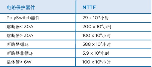 平均故障間隔時(shí)間(MTTF)是選擇電路保護(hù)器件的另一個(gè)重要考慮。MTTF與MTBF(平均無故障時(shí)間)的計(jì)算相同。其區(qū)別是MTBF是指可維修的系統(tǒng),即一次維修到下一次故障之間的時(shí)間。而MTTF則用在無法維修的情況下,如某個(gè)單一元件。