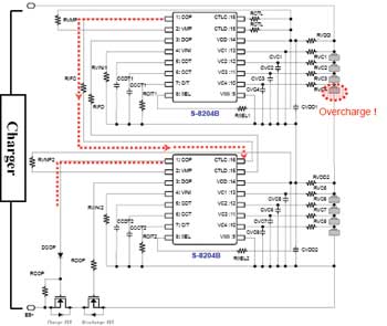 下面,詳細介紹一下保護芯片級聯(lián)的具體工作情況。還是以S-8204B為例,其CTLC端子可由芯片外部控制COP端子的輸出電壓、而CTLD端子則可由芯片外部控制DOP端子的輸出電壓。通過CTLC端子以及CTLD端子可以分別單獨控制COP端子與DOP端子的輸出電壓。并且,這些控制功能優(yōu)先于芯片內部的電池充放電保護功能。如果8節(jié)電池中的某一節(jié)電池發(fā)生過充,與該電池相連接的S-8204B的COP端子輸出電壓會發(fā)生變化,該電壓變化會傳遞到與其相連接的另一個S-8204B的CTLC端子,使得另一個S-8204B的COP端子輸出電壓也發(fā)生變化,從而控制充電控制用MOSFET關斷,實現(xiàn)鋰離子電池的過充電保護。