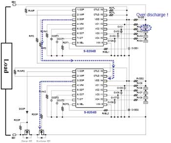如果8節(jié)電池中的某一節(jié)電池發(fā)生過放電時,則由與該電池相連接的S-8204B的DOP端子向另一個S-8204B芯片的CTLD端子發(fā)出過放信號,改變其DOP端子的狀態(tài),最終使得放電控制用MOSFET關斷,結束放電。圖2給出了采用兩個S-8204B實現(xiàn)過充電保護的電路工作原理圖(在N溝道MOSFET控制情況下),圖3是過放電保護工作原理圖。