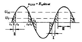 要指出的是所謂“過零”并非真的必須是電源電壓波形的零處,而一般是指在10~25V或-(10~25)V區域內進行觸發,如圖2所示。圖中交流電壓分三個區域,Ⅰ區為-10V~+10V范圍,稱為死區,在此區域中加入輸入信號時不能使SSR導通。Ⅱ區為10~25V和-(10~25)V范圍,稱為響應區,在此區域內只要加入輸入信號,SSR立即導通。Ⅲ區為幅值大于25V的范圍,稱為抑制區在此區域內加入輸入信號,SSR的導通被抑制。