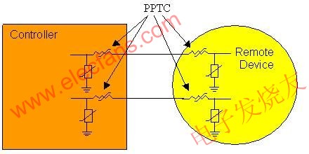 許多驅動器和控制裝置均配備了通訊和數據接口,用于各個系統元件之間的信息傳輸。而這些接口的接線有時會與交流或直流電源電纜并排敷設。這些線束可能由于正常的磨損、意外事故、安裝接線錯誤、或在中央配電箱上進行的誤操作,而出現短路現象。如果電源電纜與通訊電線出現短路現象,PolySwitch器件能夠保護任何與這條短路線路相連接的系統以免造成通訊接口的損壞。在某些情況下,這種現象有可能影響到很多系統。而PolySwitch器件在保護接口處所起的作用,可以明顯地降低設備常見故障的停運時間和修理成本。