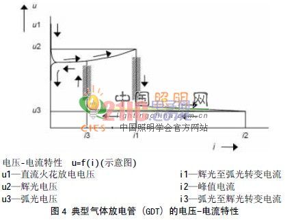 由于浪涌干擾所致,一旦加在氣體放電管兩端的電壓超過火花放電電壓(圖4的u1)時,放電管內(nèi)部氣體被電離,放電管開始放電。放電管端的壓降迅速下降至輝光放電電壓(圖4的u2)(u2在表2中的數(shù)值為140V或180V,與管子本身的特性有關(guān)),管內(nèi)電流開始升高。隨著放電電流的進一步增大,放電管便進入弧光放電狀態(tài)。在這種狀態(tài)下,管子兩端電壓(弧光電壓)跌得很低(圖4的u3)(u3在表2中數(shù)值為15V或20V,與管子本身的特性有關(guān)),且弧光電壓在相當(dāng)寬的電流變動范圍(從圖4的i1→i2過程中)內(nèi)保持穩(wěn)定。因此,外界的高電壓浪涌干擾,由于氣體放電管的放電作用,被化解成了低電壓和大電流的受保護情況(u3和i2),且這個電流(從圖4的i2→i3)經(jīng)由氣體放電管本身流回到干擾源里,免除了干擾對燈具可能帶來的危害。隨著浪涌過電壓的消退,流過氣體放電管的電流降到維持弧光放電狀態(tài)所需的最小值以下(約為10mA~100mA,與管子本身的特性關(guān)),弧光放電便停止,并再次通過輝光放電狀態(tài)后,結(jié)束整個放電狀態(tài)(熄弧)。