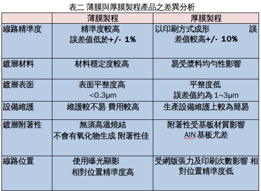 但從產品成本結構來看,如表二所示薄膜產品的工藝設備(黃光微影)與生產環境(無塵或潔凈室)相較于厚膜產品其成本較高,然而薄膜工藝的金屬線路多以厚銅材料為主,相較于厚膜印刷之厚銀而言,材料成本卻相對較低,因此,可預期的當利用薄膜工藝將陶瓷基板金屬化的產品,日漸達到經濟規模時,其成本將逐漸趨近于厚膜產品。