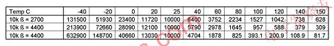 表1:該表顯示了一個典型的10kΩ標稱熱敏電阻在3個不同β值時的電阻值。