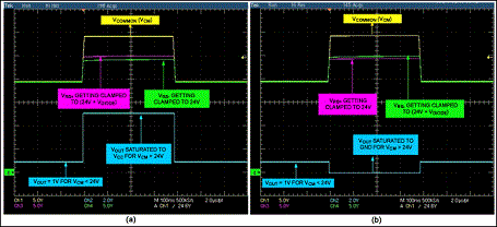圖2是當移走D1時,35V拋負載脈沖下放大器的輸出。施加電壓為電池標稱電壓,所要求的輸出電壓為1V (輸入VSENSE = 50mV、增益 = 20)。出現拋負載電壓時,齊納管把輸入共模電壓鉗位在大約24V,放大器輸出經過幾個短暫的波動后穩定到0V。