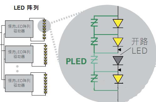 以上方案能夠有效的應對電源部分產生的浪涌威脅,保護LED免受損壞。但是我們都知道,LED燈等通常由一定數量的LED管串接或并聯組成陣列,單個LED損壞會造成的整個LED陣列的停止工作。因此在LED陣列端,LF專門為LED開路研制了PLED LED開路保護器,如圖所示: