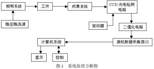 整個(gè)檢測(cè)系統(tǒng)由照明系統(tǒng)、被測(cè)工件系統(tǒng)、成像物鏡、CCD 光電檢測(cè)系統(tǒng)和計(jì)算機(jī)測(cè)控系統(tǒng)(8031 單片機(jī)和8279 鍵盤(pán)/顯示芯片等)構(gòu)成。穩(wěn)壓穩(wěn)流調(diào)光電源為遠(yuǎn)心照明系統(tǒng)提供穩(wěn)定的照明光,被照明的工件經(jīng)成像物鏡成像在線陣CCD 的光敏陣列面上。由于工件不透光,工件的像在中間部分形成暗帶,兩側(cè)形成亮帶。 暗帶的寬度就是工件尺寸所成像的大小。線陣CCD 在驅(qū)動(dòng)脈沖的作用下完成光電轉(zhuǎn)換并產(chǎn)生視頻信號(hào)。其系 統(tǒng)原理圖如圖1。