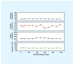 基于硅的瞬態電壓抑制器件工作在標準P/N結的擊穿狀態,相比基于聚合物-間隙(polymer- gapbased)的器件可提供相對低的觸發電壓和鉗位電壓。該類器件的泄漏電流比空氣間隙器件(air-gap device)的高10~20倍,其相對較高的固有電容導致高信號失真和插入損耗。基于空氣間隙的器件在以上討論過的所有技術中可提供最低的電容和鉗位電壓,其工作在兩個電極間的惰性氣體擊穿狀態。基于空氣間隙的器件可以防止高達15kV的脈沖,它們在經歷1000次脈沖沖擊后性能特點也相當穩定(如圖2 所示)。基于空氣間隙的器件泄漏電流略高于基于聚合物-間隙的器件,但是其電容和插入損耗與聚合物器件相當或者稍好一些,并且其鉗位電壓和觸發電壓要低得多。