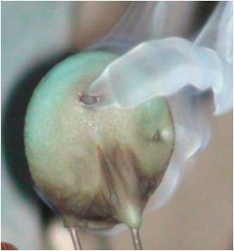 圖5:MOV14D471 在600V*5A 電流試驗后圖片 圖6:MOV14D471 在600V*10A 電流試驗后圖片