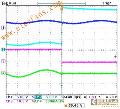 圖2的波形代表一個(gè)工作電路。放大器的輸出之一(上跟蹤,深藍(lán)色)是一個(gè)1kHz正弦波直流偏壓為2.5V。第二次跟蹤(青色)是線束上看到的信號(hào)。這也從一開始就是在2.5V直流偏置一個(gè)1kHz正弦波,但200μs是一個(gè)18V電源短路。第三次跟蹤(洋紅色)是分流穩(wěn)壓器輸出,最初在11V的偏見,但拉回應(yīng)過壓條件地面。第四次跟蹤(綠色)線束的電流。最初是一個(gè)正弦波,電流下降到零這個(gè)回應(yīng)過壓條件。