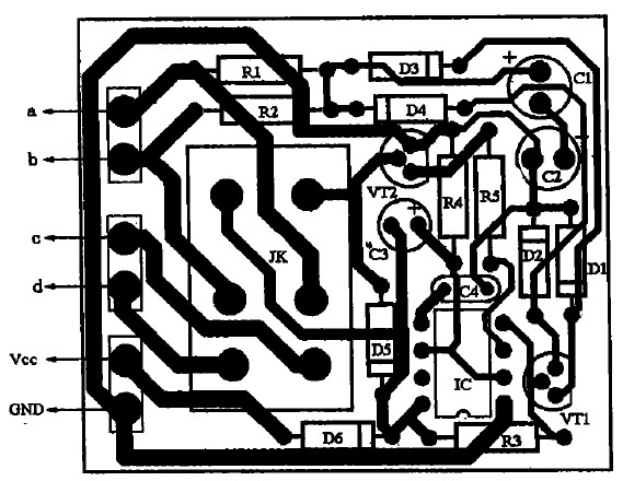 3.當(dāng)功放工作異常或者意外損壞而導(dǎo)致中點(diǎn)電位過(guò)高(高于1.8 V)時(shí),直流電壓經(jīng)R1、R2限流,送至C1、C2濾波及D1~D4整流,約1~2s(秒),晶體管VT1導(dǎo)通,555的④腳由高電平變低電平,555被直接復(fù)位,③腳輸出低電平,晶體管VT2截止,繼電器JK失電,常開(kāi)觸點(diǎn)跳開(kāi),將揚(yáng)聲器與功放電路斷開(kāi),有效地保護(hù)了揚(yáng)聲器不受損壞。