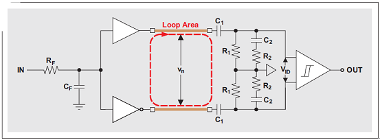 電容隔離器由兩塊硅芯片—一個發(fā)送器和一個接收機組成(請參見圖 2)。數(shù)據(jù)傳輸在由兩個電容構(gòu)成的差動隔離層之間進行,在每個電容的二氧化硅 (SiO2) 電介質(zhì)兩端都有一塊銅頂片和一個導電硅底片。發(fā)送器芯片的驅(qū)動器輸出通過一些接合線連接到接收機芯片上隔離電容的頂片。通過將電容的底片連接接收機輸入構(gòu)成了一個導電環(huán)路。圖 3 顯示了隔離層的等效電路結(jié)構(gòu)圖,并標示出了金接合線之間的環(huán)路區(qū)域。很明顯,穿過該環(huán)路的磁場將會產(chǎn)生一個 EMF,其表示下面 RC 網(wǎng)絡的輸入電壓噪聲 Vn1。我們常常碰到的第二種差動噪聲部分 Vn2,其產(chǎn)生原因是共模噪聲到差動噪聲的轉(zhuǎn)換。兩個噪聲分量共同組成了綜合噪聲 Vn。如果只考慮 EMF 的影響,則可以保守地將 Vn 一分為二: