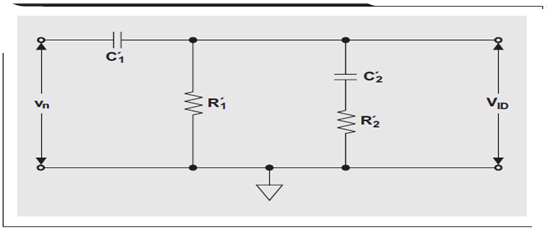 一次電路仿真證實了 RC 網(wǎng)絡為一個一階高通濾波器,其 C′1 和 R′1 為主要組件,頻率高達 100 MHz(參見圖 5 中藍色曲線)。超出這一頻率以后,寄生組件 C′2 和R′2生效,從而引起稍稍偏離于線性的斜率。因此,頻率達到 100 MHz 以后,增益響應可以表示為 VID/vn 的比: