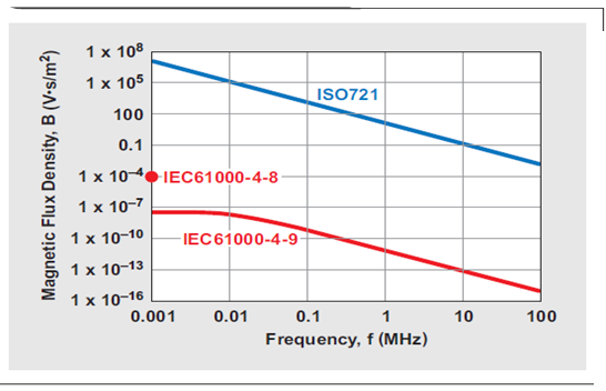 超出電容隔離器差動電路噪聲預算的磁耦合要求 1MHz 下大于 11.7 V•s/m2(117千高斯) 的磁通量密度。這需要在一個距離器件 0.1m 的導體中有超過 5 百萬安的電流才能產(chǎn)生這樣一個磁場。在自然界或者任何制造設(shè)備中這都是不可能存在的。如果的確存在,那么設(shè)計人員便可做以下情況假設(shè):在隔離層失效以前,周圍的電路便都已失效。