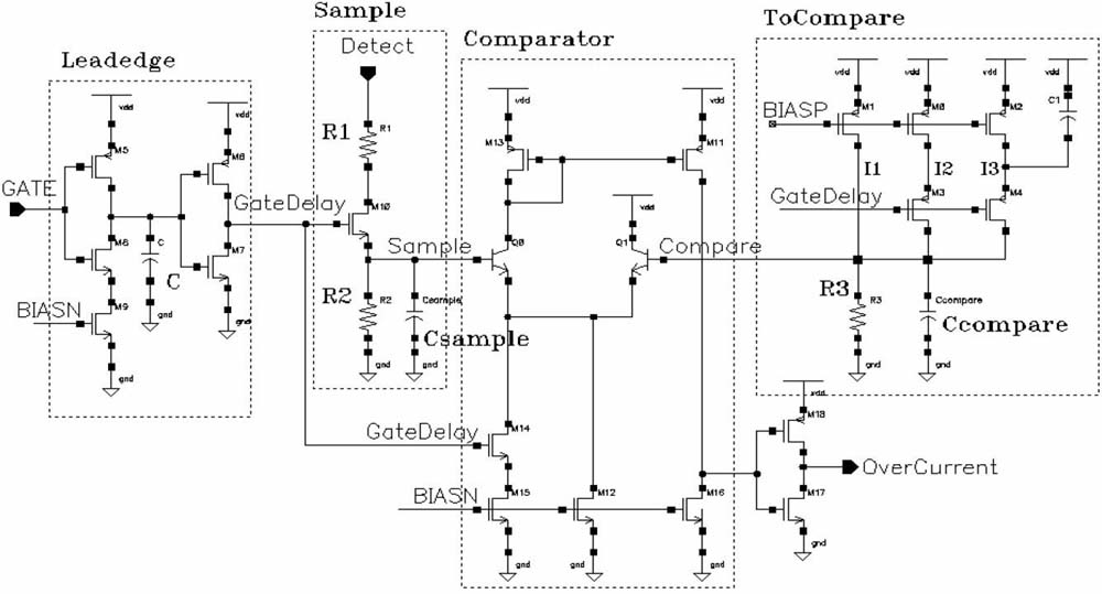 直接檢測漏端電壓判斷LDMOS 是否過流的設計思想是在LDMOS 管導通時,通過采樣電路檢測LDMOS 漏端電壓,經比較,過流比較器輸出一個低電平過流信號以關閉LDMOS 管;而在LDMOS 管截止期間,采樣電路不工作,同時為了提高可靠性將比較器窗口電平適度拉高。