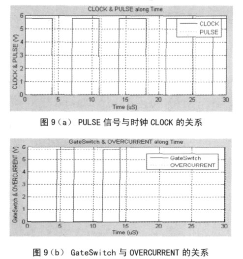 控制邏輯模塊如圖4 所示,該模塊直接控制LDMOS 的開關。PULSE 信號的上升沿對應是CLOCK 時鐘的開始,PULSE 信號與時鐘CLOCK 的關系如圖9 所示。當發生過流時,OVERCURRENT信號為低,觸發器R 端為高,Q 為低,GateSwitch 信號為低,關斷LDMOS,從而實現過流保護功能。